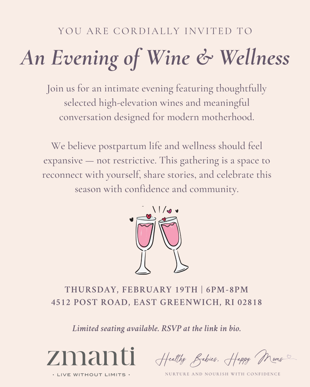 An Evening of Wine & Wellness for Modern Mothers Thursday, February 19, 2026 6:00 PM 8:00 PM Healthy Babies, Happy Moms Inc. 4512 Post Road East Greenwich, Rhode Island 02818 (map) Google Calendar ICS RSVP HERE
